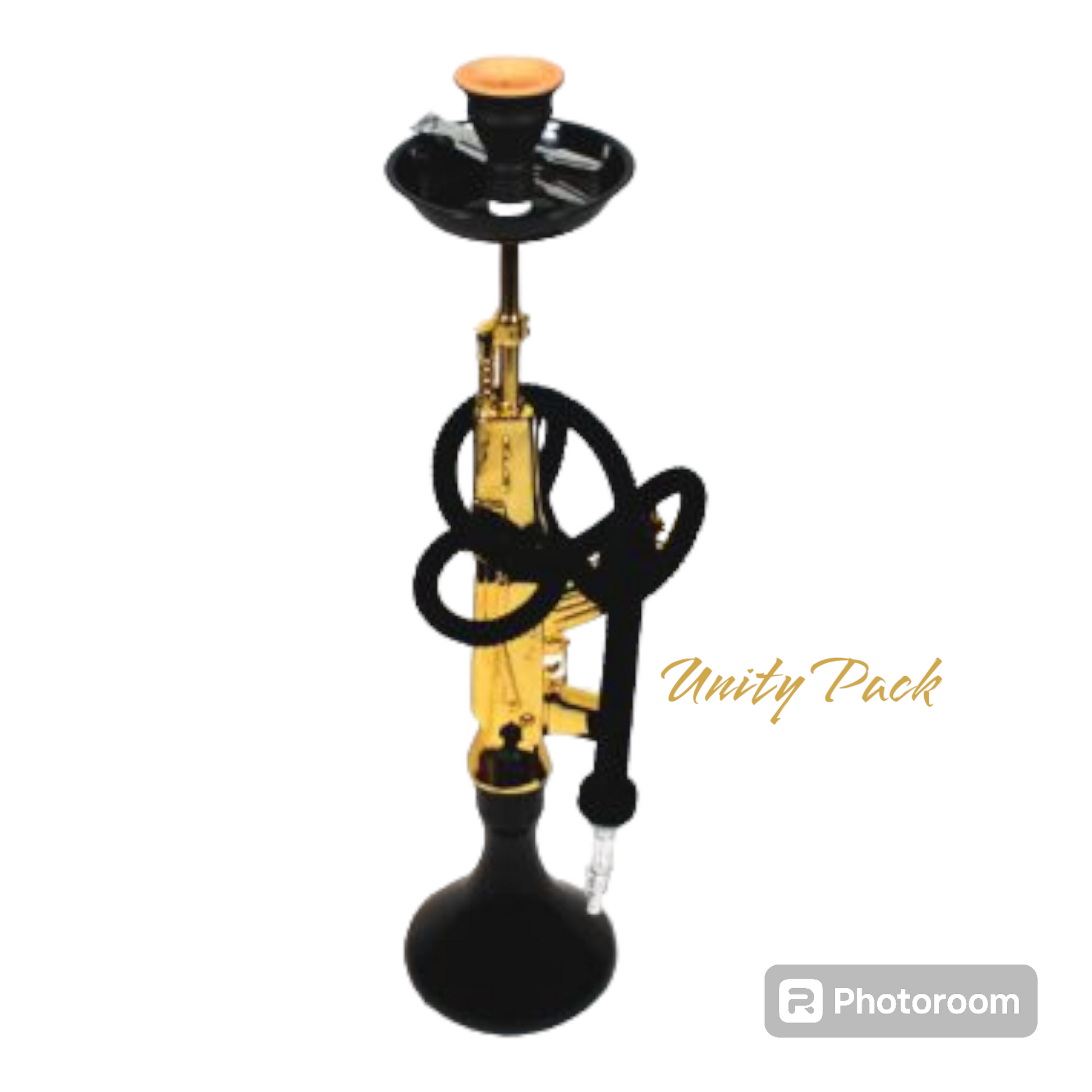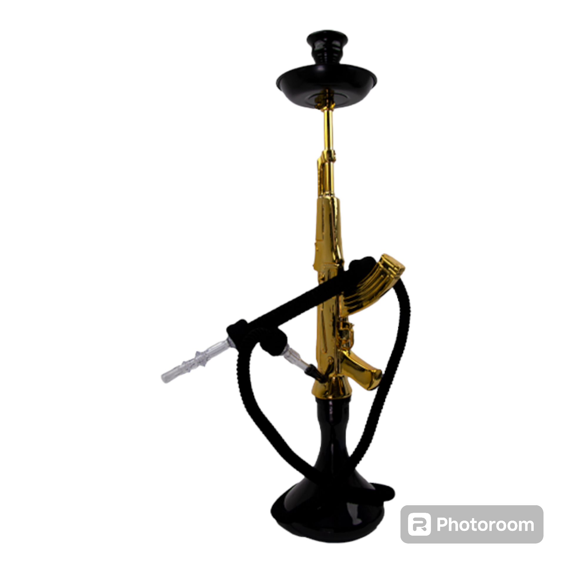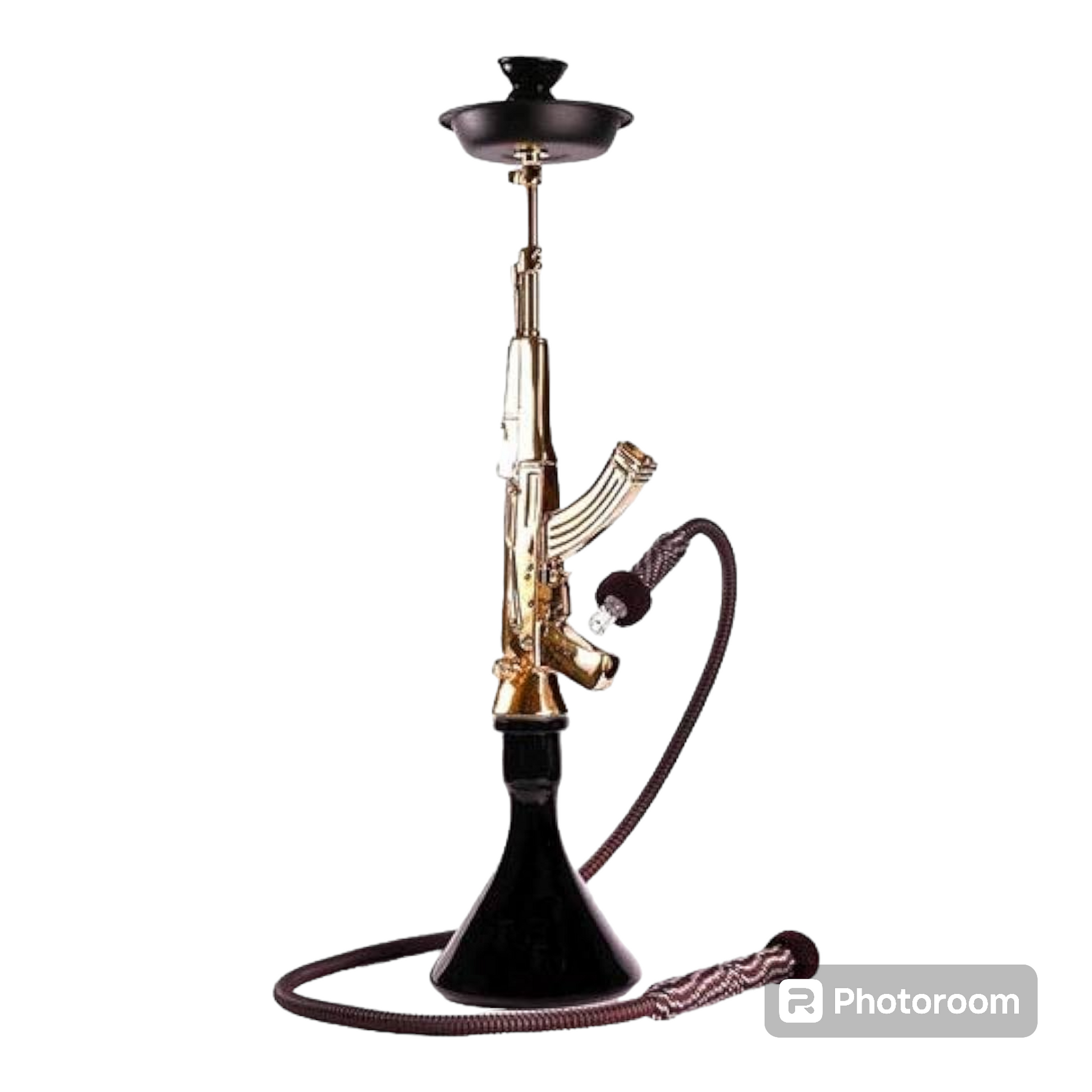 "Get lit with our AK-47 Shisha in Gold! This water pipe doubles as a bong for a smooth and satisfying smoking experience. Perfect for sharing with friends, or just for you (wink, wink). No need to bring out the big guns, this shisha has got you covered (literally)."