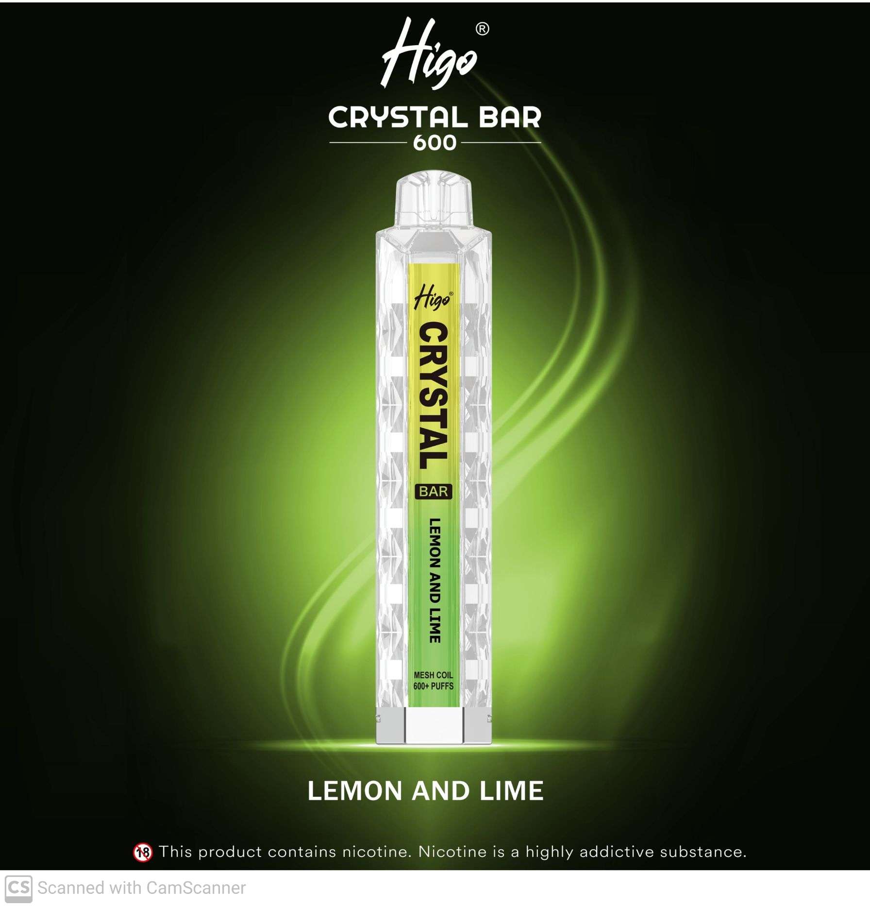 Introducing HIGO CRYSTAL 600 in a convenient, 10s pack, featuring the refreshing flavour of Lemon and Lime. With each puff delivering a satisfying vaping experience, this disposable vape offers 600 puffs per device. Perfect for on-the-go enjoyment.
