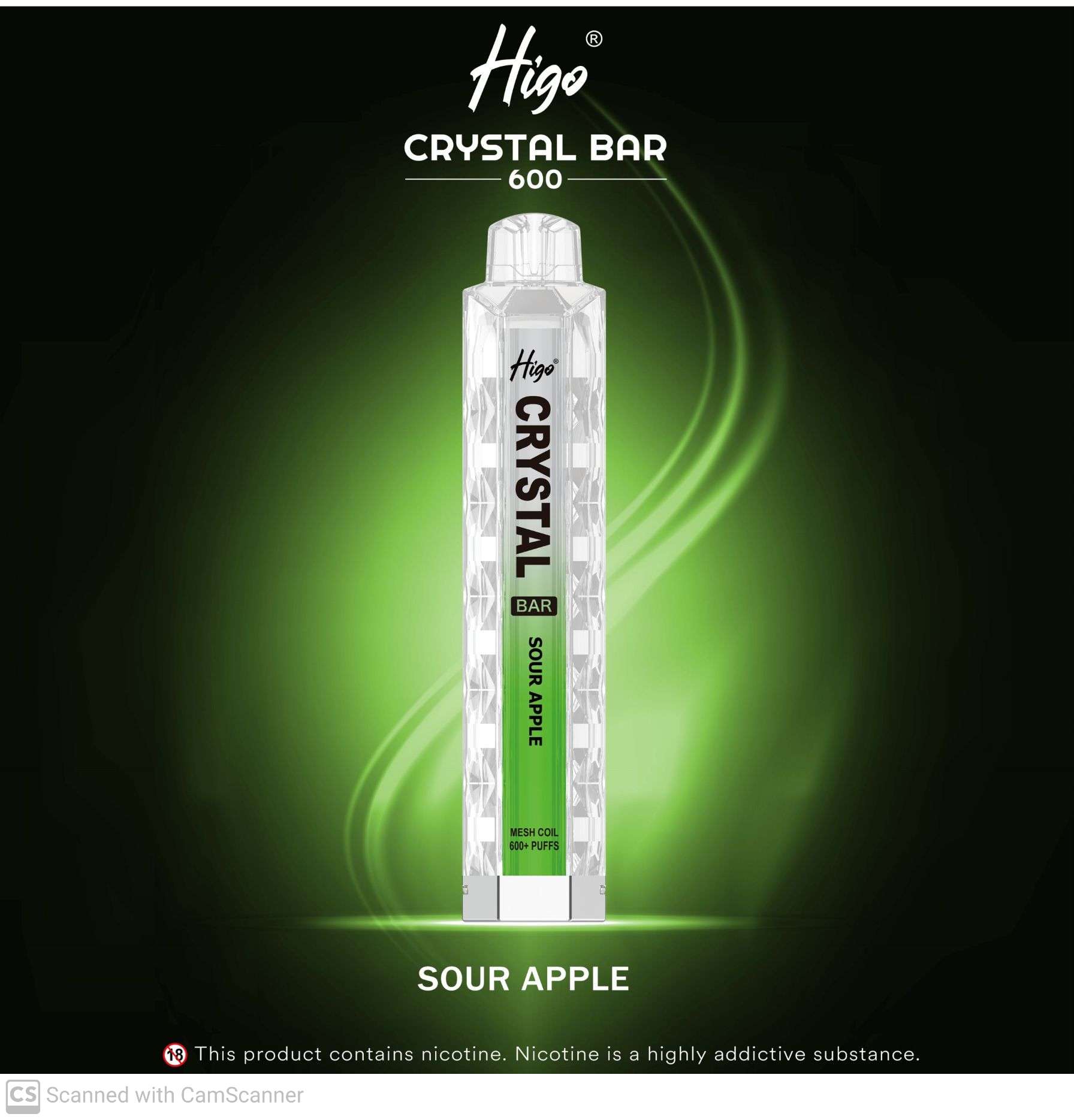 Introducing HIGO CRYSTAL 600 in a convenient, 10s pack, featuring the refreshing flavour of Sour Apple. With each puff delivering a satisfying vaping experience, this disposable vape offers 600 puffs per device. Perfect for on-the-go enjoyment.